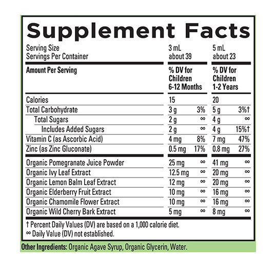 Organic Agave Syrup, Organic Glycerin, Water, Organic Pomegranate Juice Powder, Vitamin C, Organic Ivy Leaf Extract, Organic Lemon Balm Lead Extract, Organic Elderberry Fruit Extract, Organic Chamomile Flower Extract, Wild Cherry Bark Extract, and Zinc.