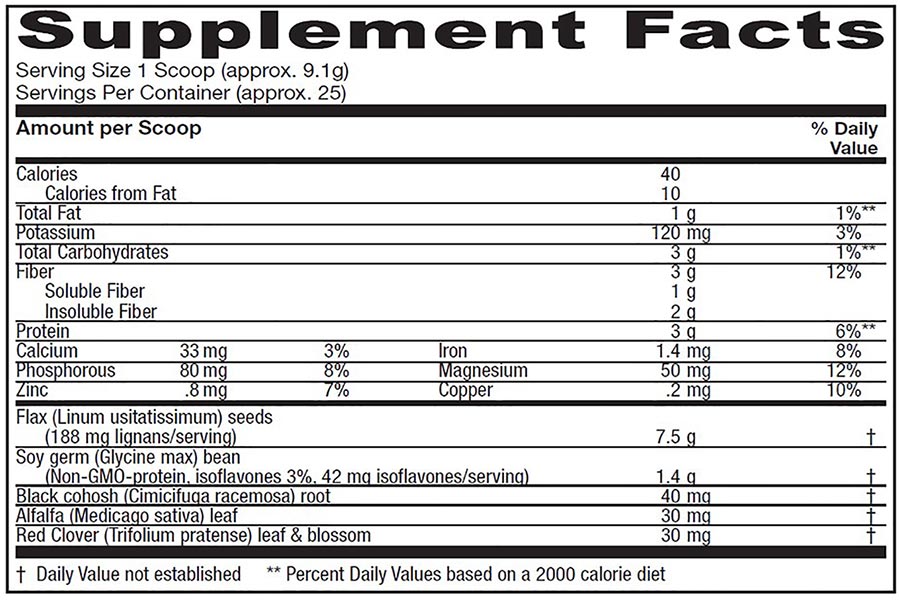 This progressive powdered formula offers a phytoestrogen-rich blend of botanicals and non-GMO soy isoflavones and flaxseed lignans; women in all stages of menopause may benefit from a high dietary intake of phytoestrogens.